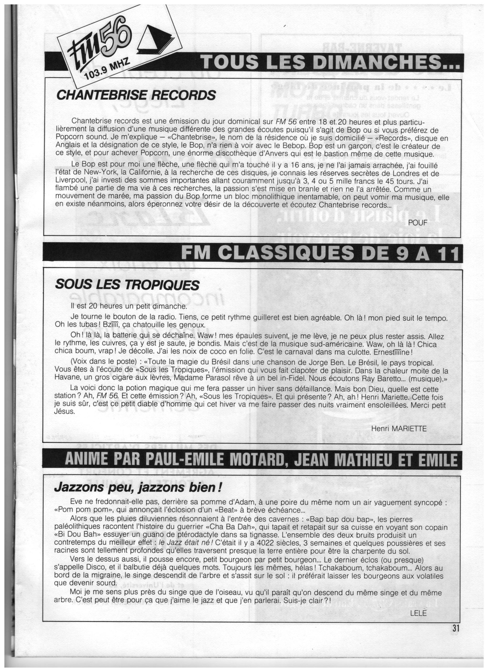 Pour compléter cette histoire de FM 56, le 1er janvier 1987, elle devient SiS Liège et perd aisni son âme de radio liégeoise, en 1988, lorsque les activité de SiS s’arrêtent, elle passe sous le label Nostalgie, et puis sous celui de NRJ