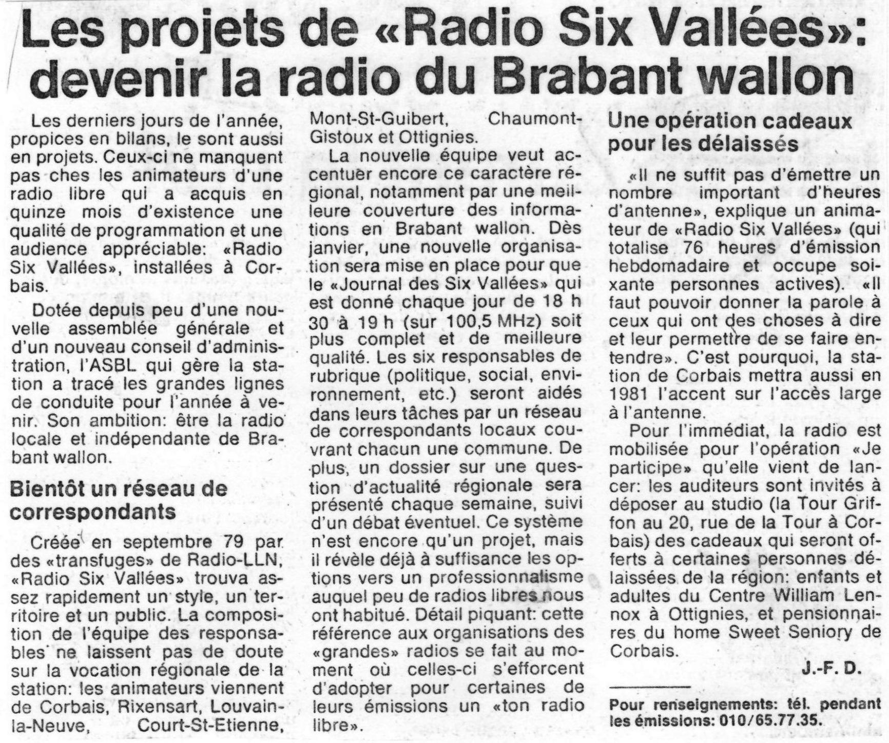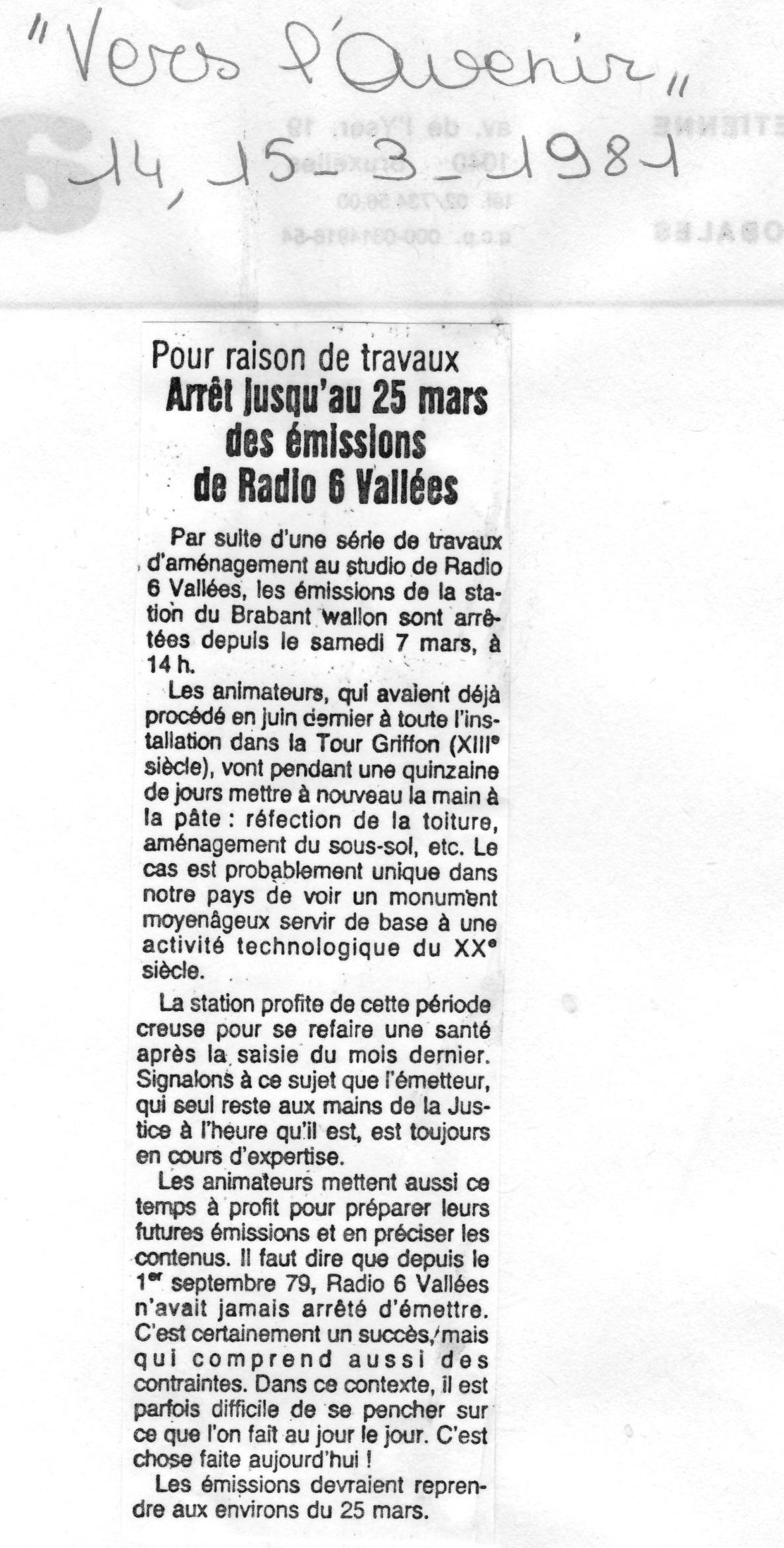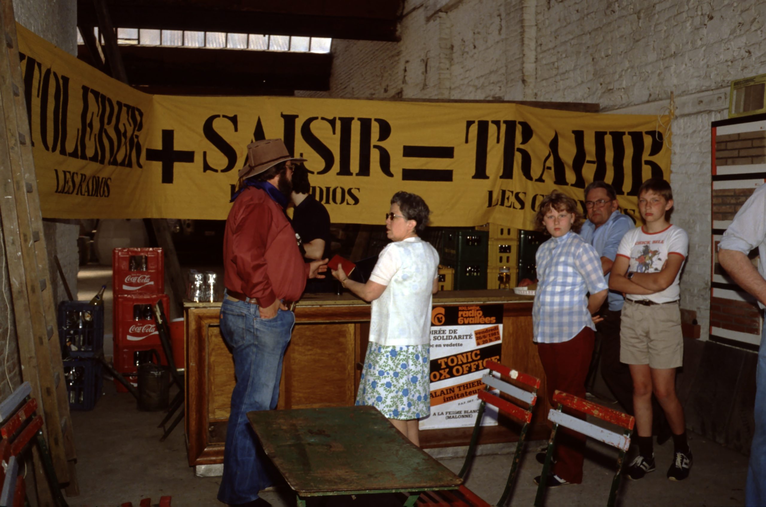 la première saisie de la radio le 10/02/1981. Ce jour-là, les émissions commençaient vers 16 H30 par une émission religieuse Evangélique qu’assurait le plus vieil animateur de la radio (92 ans). Bref le pauvre homme paniqué les a laissé emporter notre émetteur + tout le matériel de studio. Immédiatement nous avons contacté Yves Jongen (technicien de Radio LLN) 3/4 d’heure plus tard nous réémettions. Il faisait froid ce jour-là et il y avait de la neige. Nous avons émis jusqu’à minuit pour dire que nous avions été saisis. C’est ce soir-là que nous nous sommes rendu compte de l’étendue de notre auditoire. Les gens déboulaient danss le studio des politiques également le tél n’arrêtait pas de sonner. Durant cette soirée était lancée une pétition. Nous avons passé le restant de la nuit à rédiger des communiqués, des lettres aux politiques du BW et nous sommes allés les déposer dans leur boite perso et aux rédactions des journaux. Une nuit de folie.